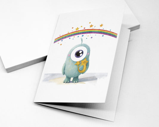 Schmunzel MONSTER - Set - Einäugige süße Figuren zum Aufhängen oder Verschenken- Postkarten A6 oder A5 oder Klappkarten + Briefumschläge
