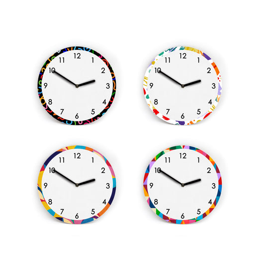 Wanduhr mit bunter Bordüre - Mit und ohne Striche und Zahlen - Verschiedene farbenfrohe Muster - 3 Größen - Leises Uhrwerk